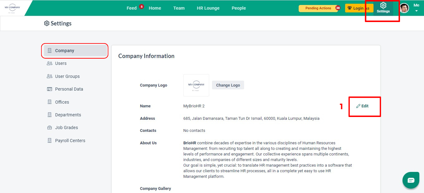 Once you have logged in to your BrioHR account, click on the Settings icon (top right corner of the page).
