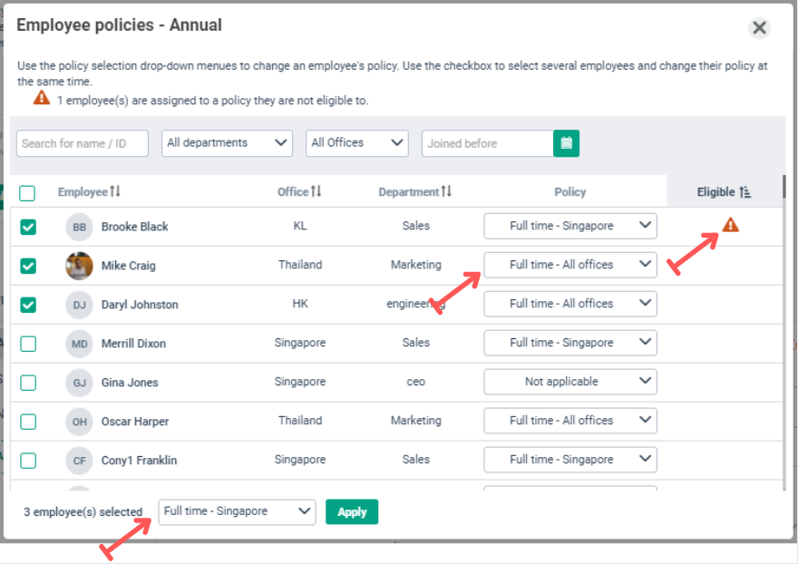 You can also check if there is any inconsistent policy. For example, if an employee changes office and therefore becomes ineligible to this policy, you will be able to see a warning there.