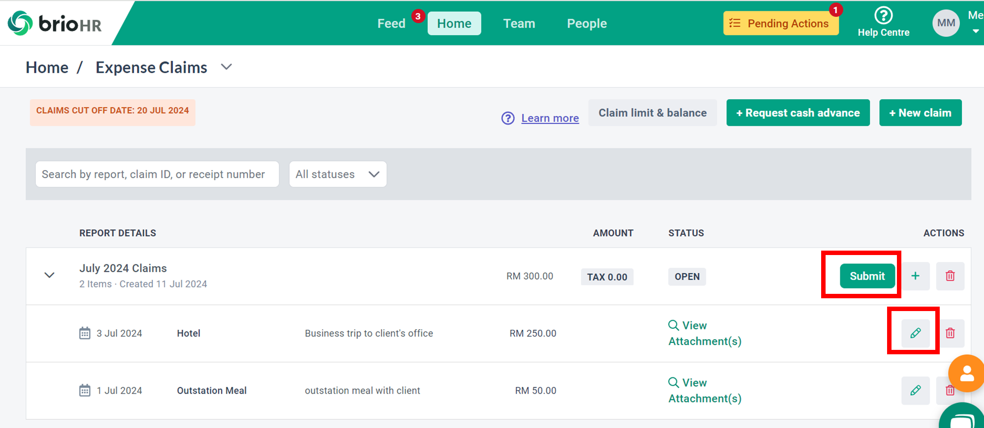 7. Click Submit once done. Your approver will be notified to process your claim request.