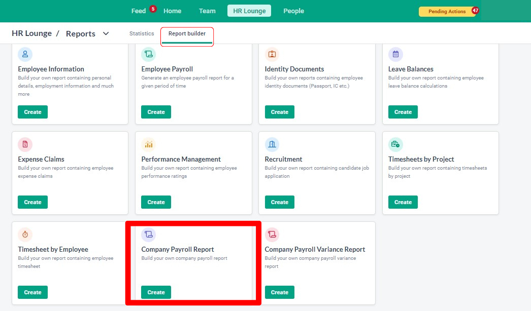 2. Next, click on Report builder > Company Payroll Report > Create.