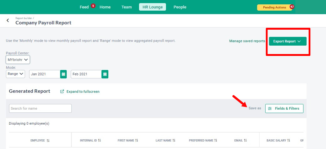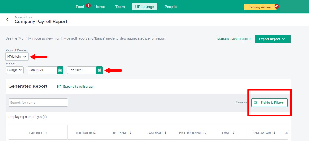 (Use the 'Monthly' mode to view monthly payroll report and 'Range' mode to view aggregated payroll report.)