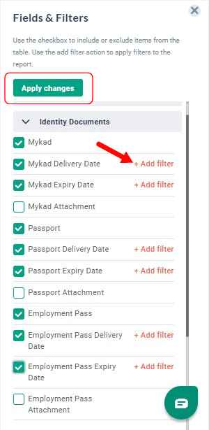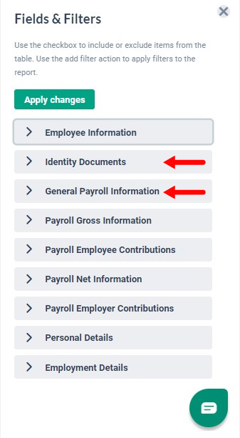 c. Click on the Fields & Filters icon, to include the Identity Documents and General Payroll Information.
