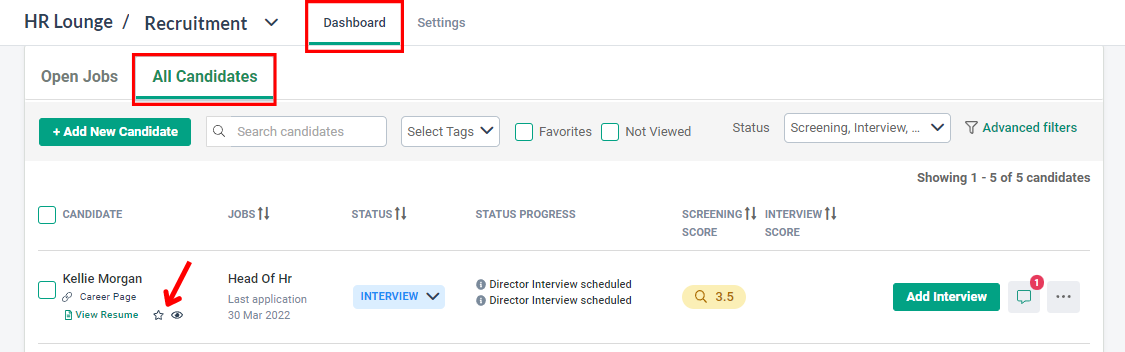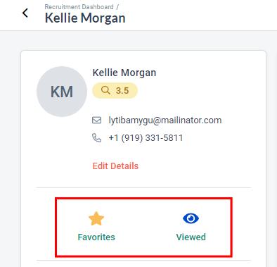 *NOTE: When a candidate has been added as "Favorite" or "Mark as viewed" from HR Lounge > Recruitment module, the information can be viewed by anyone else with access to HR Lounge > Recruitment module as well.