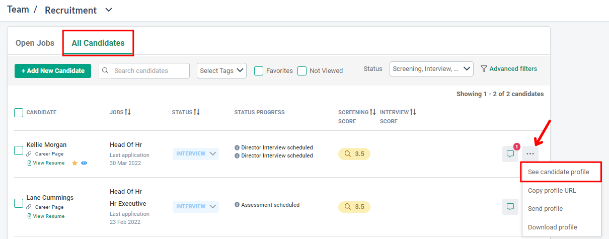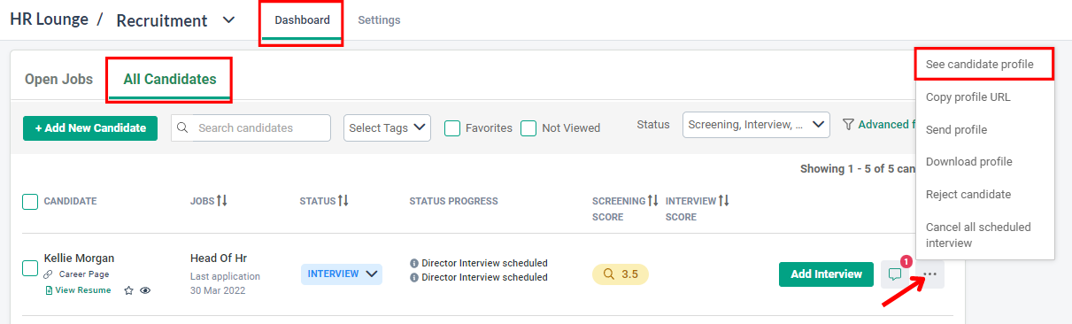 3. At the "..." icon, click on See candidate profile.