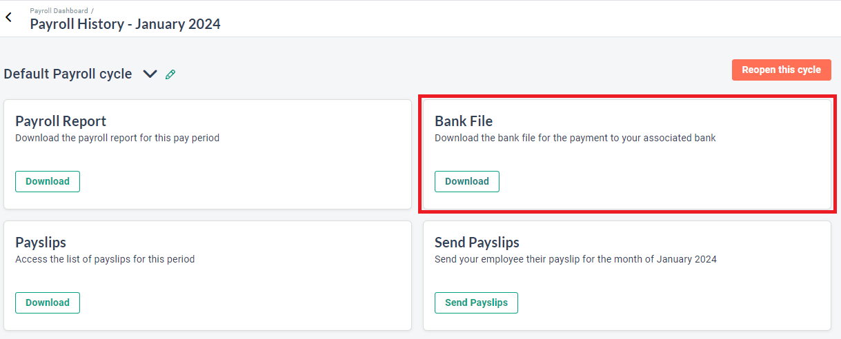 3. Scroll down to the Bank File column, and depending on your payroll cycle, click on the Download button (as shown in the sample screenshots below) to download the bank file.