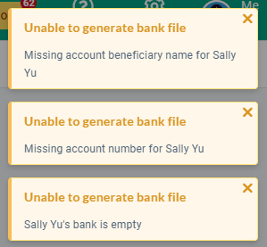 If there is any missing information, you will not be able to generate the bank file. A warning prompt will appear (as shown in the screenshot below).