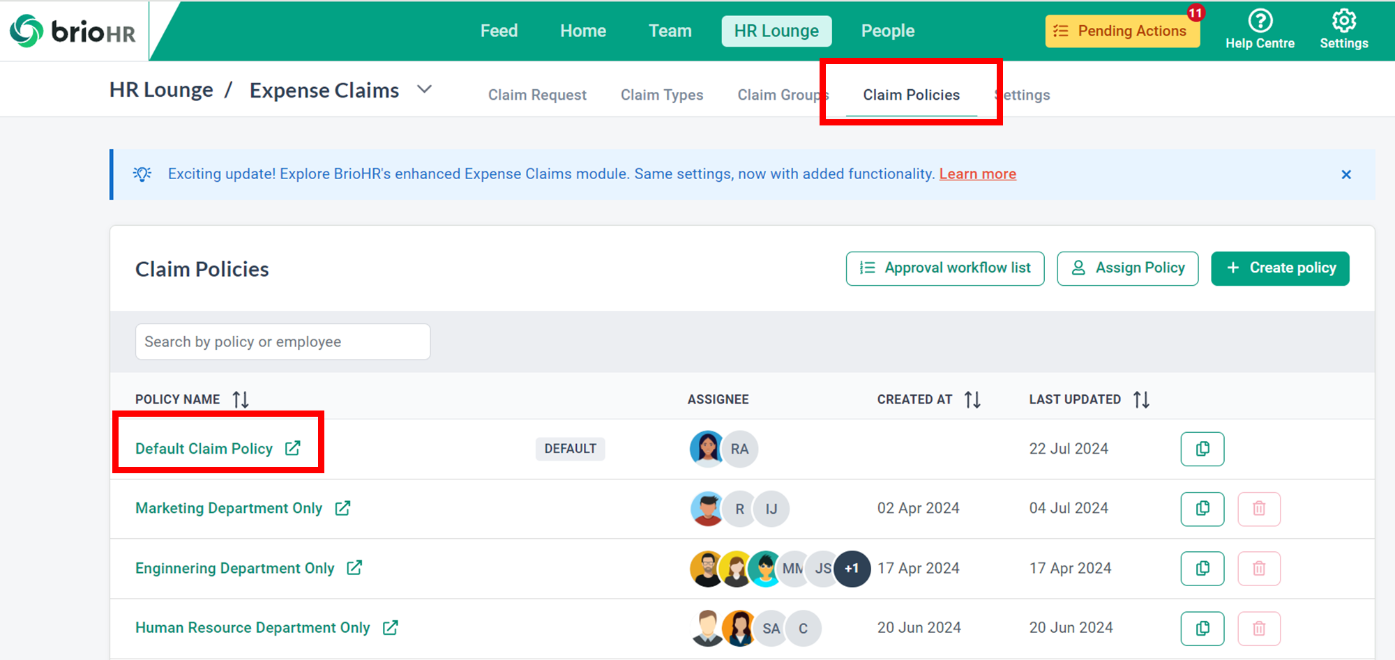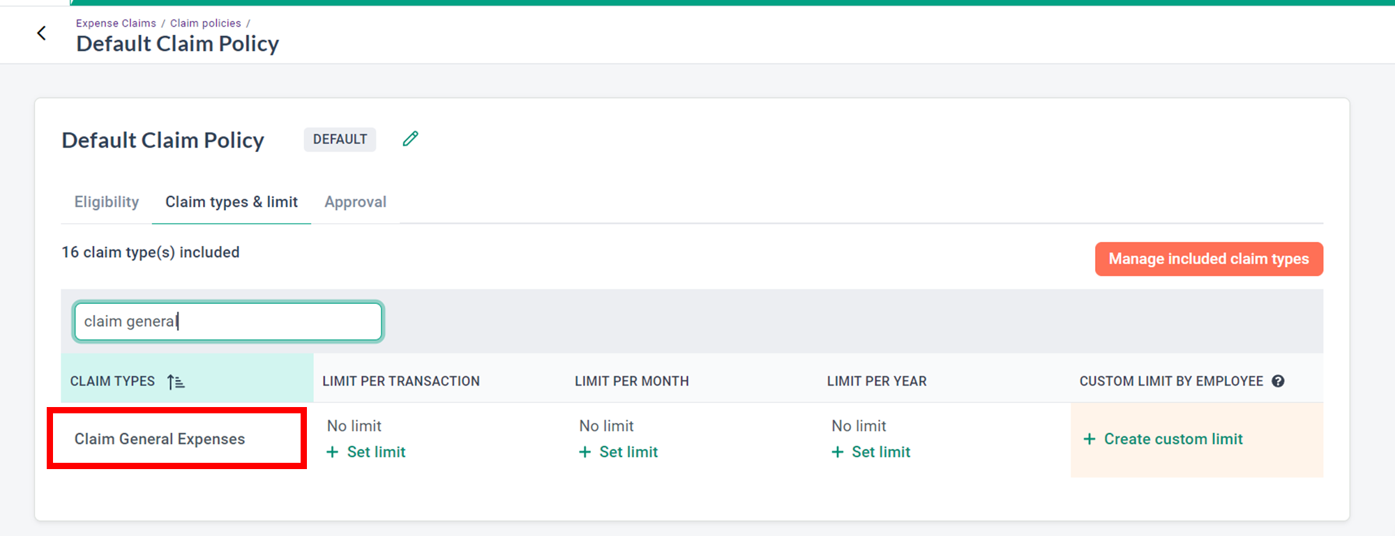 2. Go to Claim Policies > Select which claim policy you would like to include this new claim type (eg, Default Claim Policy)