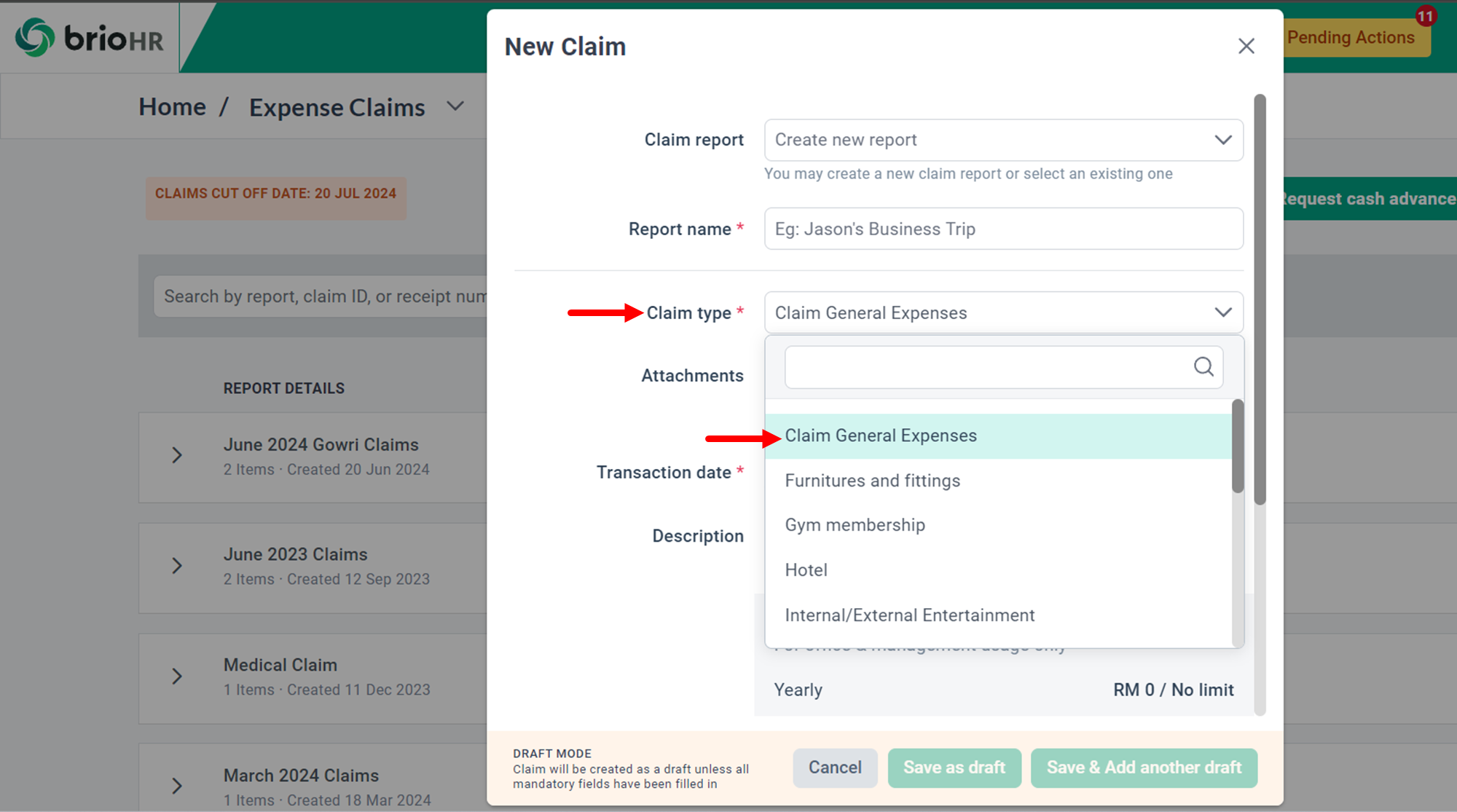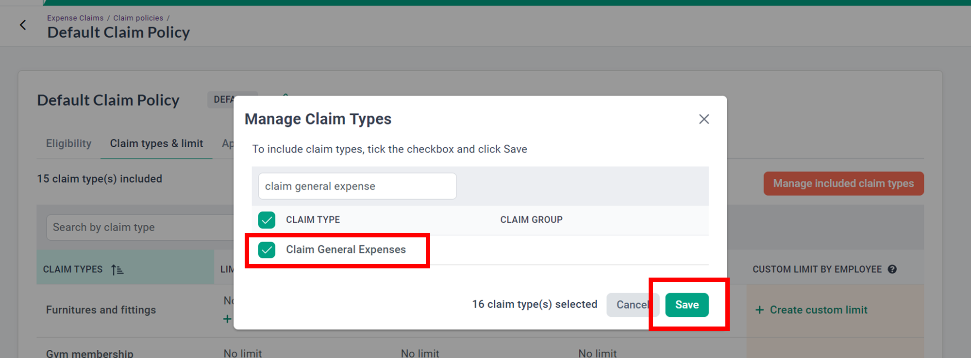8. The claim type is now included in the claim policy. All employees assigned to this claim policy will be able to find this new claim type in claim drop down menu